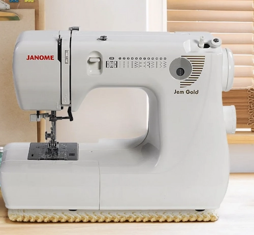 Compact portability and convenience features unite in the Jem Gold 660. Quality components ensure reliability, including a jam-proof drop-in bobbin and horizontal full rotary hook. Convenient extras include a built-in needle threader, one hand thread cutter, fail-safe needle insertion, and quick foot conversion.